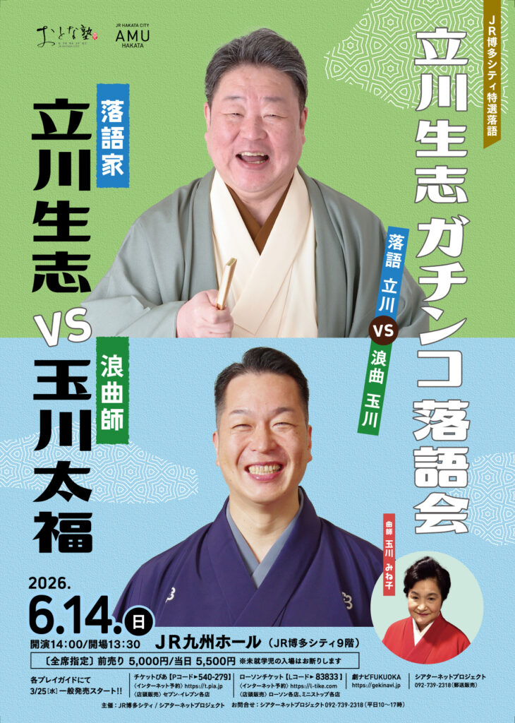 本格派の人情噺を得意とする立川生志と、古典から新作まで自在に語る玉川太福とのガチンコな舞台にご期待ください。